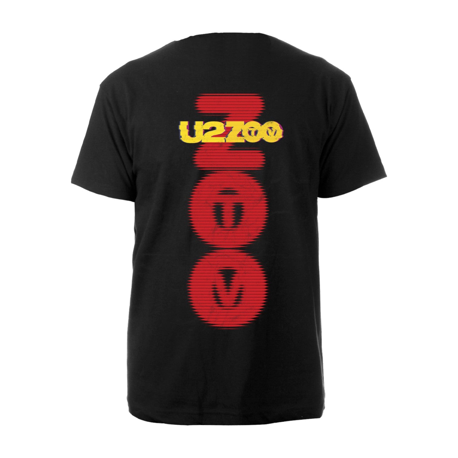 A lightweight, super-soft cotton unisex t-shirt in black, featuring a ZOO TV band photo design on the front and vertical ZOO TV logo on the back.