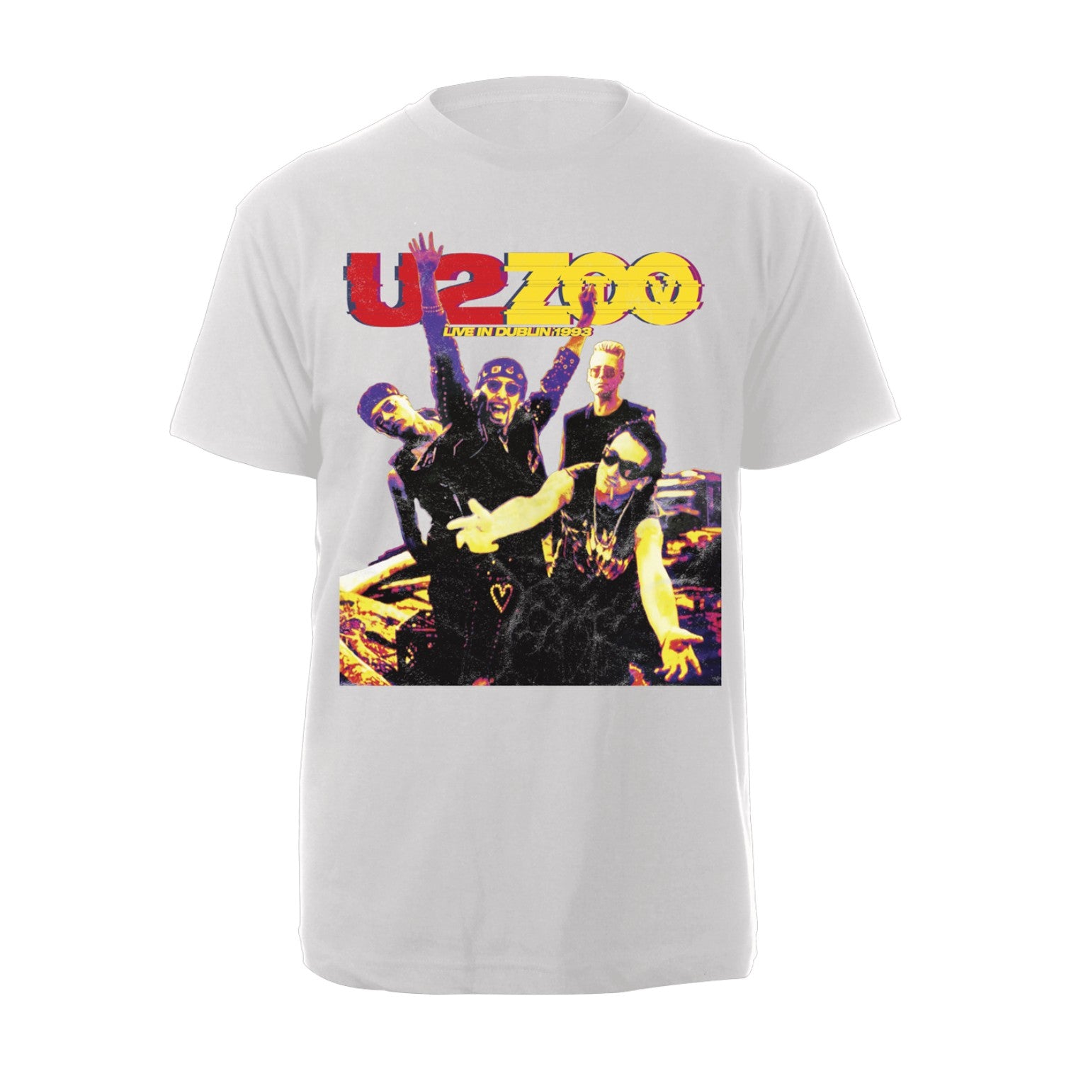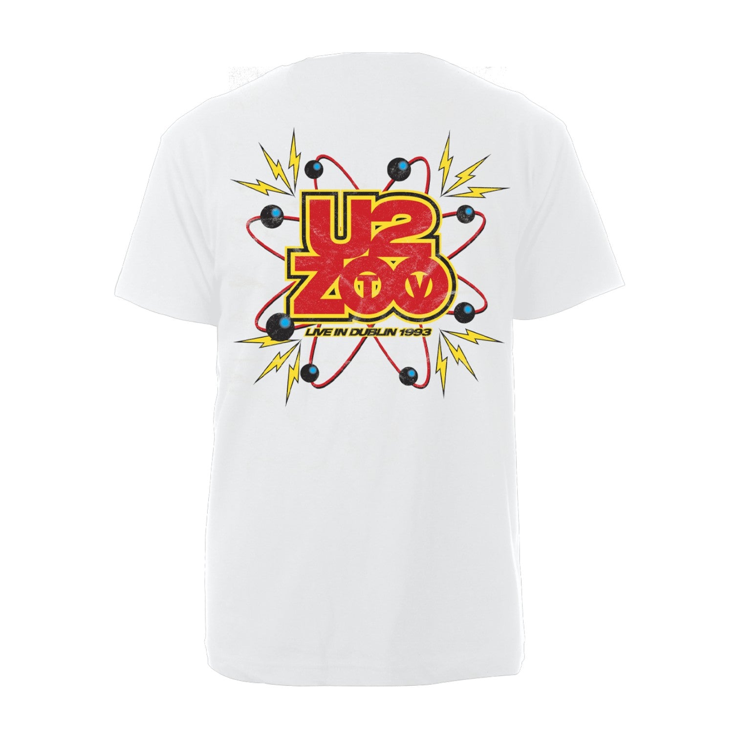 A lightweight, super-soft cotton unisex t-shirt in white, featuring a ZOO TV band photo design on the front and ZOO TV Atom logo on the back.