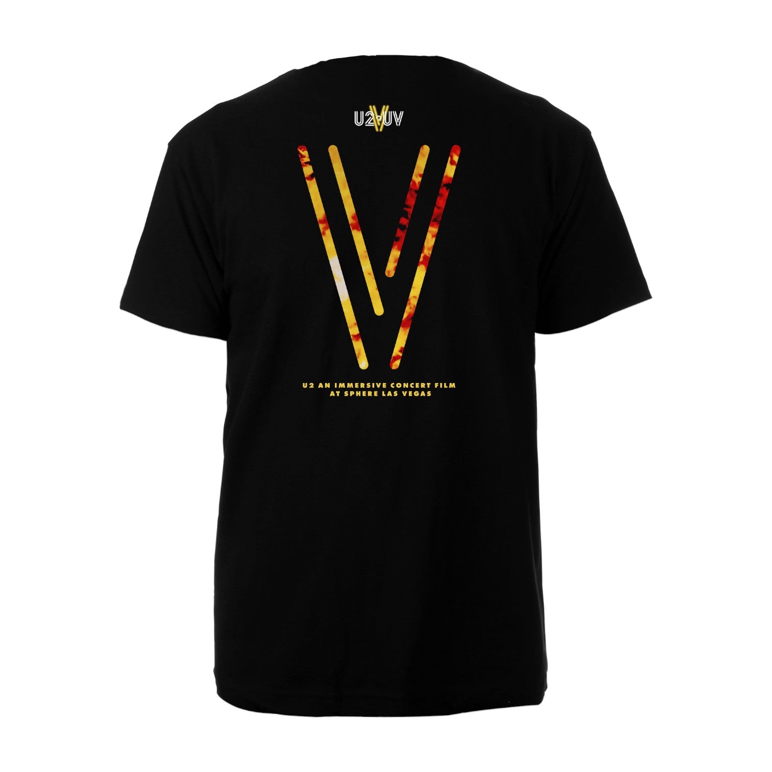 A cotton unisex t-shirt in black, featuring V-U2 Last Vegas Sphere designs on the front and back. Photography by Rich Fury. Image by John Gerrard.